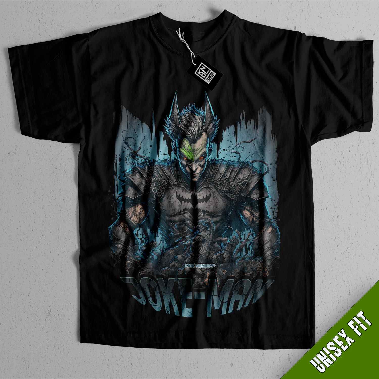 Introducing our "JOKE-MAN" t-shirt, featuring an illustration of our original mashup character of Batman and Joker. This shirt is a unique and playful take on the iconic rivalry between these two iconic DC characters, blended into one new powerful and unpredictable entity.